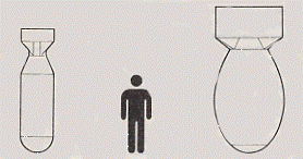 2. A sinistra vi è il disegno di come si presentava la bomba usata su Hiroshima, la Chico realizzata con U 235 e del peso di 4 tonnellate, e a destra quella utilizzata su Nagasaki, la Gordo realizzata con Pu 239 e del peso di 4,5 tonnellate. Per un confronto, al centro vi è la dimensione di un uomo medio. Ricordo solo che delle masse delle due bombe solo una piccolissima frazione era di esplosivo nucleare.